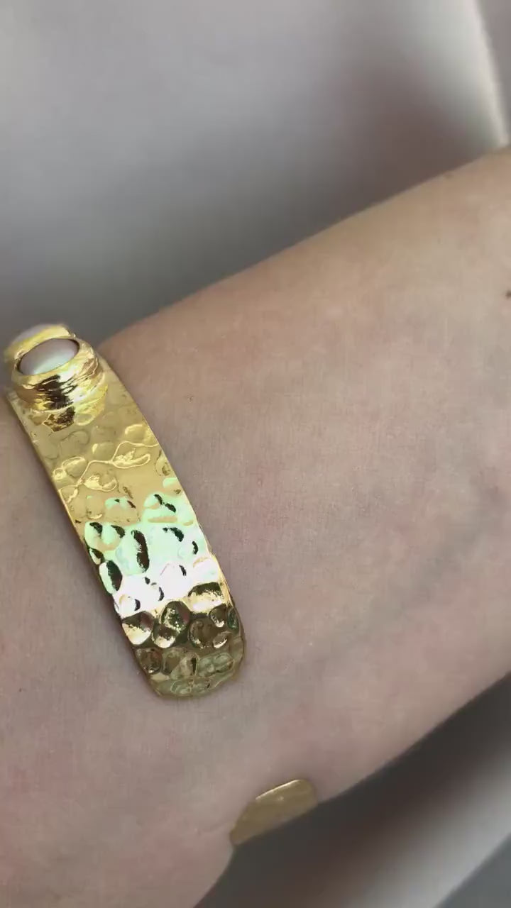 Dainty soft hammered bangle with approx 9mm pearl and open cuff in recycled metal.