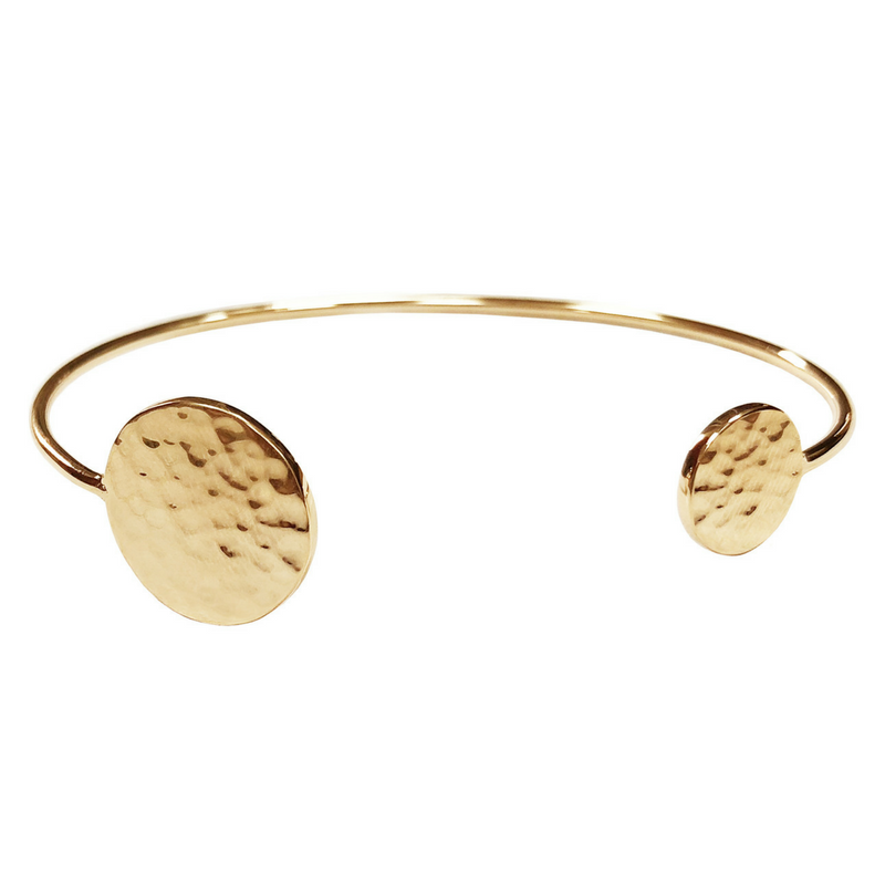 Freshen up your jewellery closet with this chic hand hammered disc gold bangle cuff. We love the hand-hammered texture of this beautiful gold bracelet. It is adjustable so fit to all sizes and bit flexible for easy wearing.
