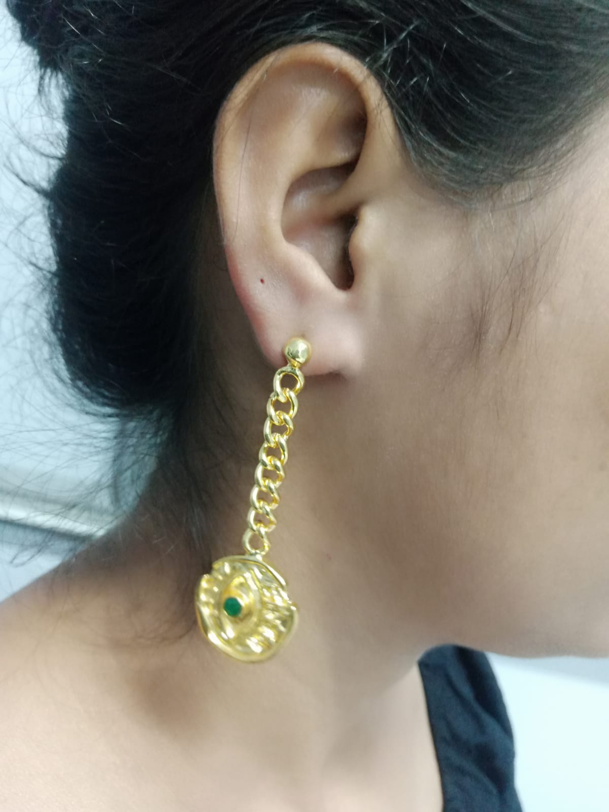 Discover the vintage feel in you with our organic look Roman Evil Eye sturdy chain earrings. Vezoora new launch Roman Evil Eye vintage look statement chain earrings are handmade from 21ct gold plated recycled brass with a smooth brushed texture. We sparked it up with Green Onyx Gemstone. Its easy-to-wear design will be an instant hit with vintage jewellery lovers and can be worn anywhere and with any look