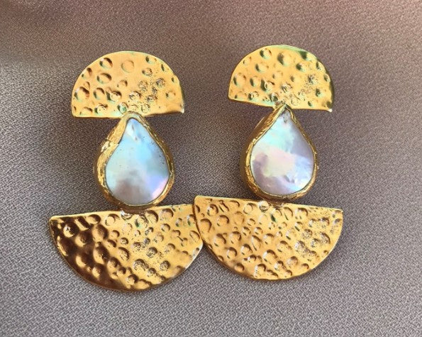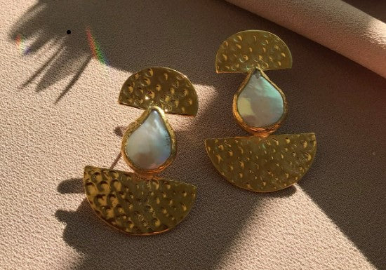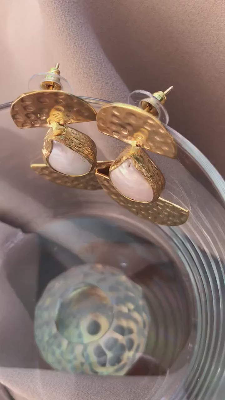 Alisha earrings Designed to make an instant impact, these organic freshwater pearl earrings feature hand hammering by Vezoora artisans and beautifully set pearls. Handmade in our workshop, these earrings will definitely make heads turn. 21ct gold-plated recycled brass.