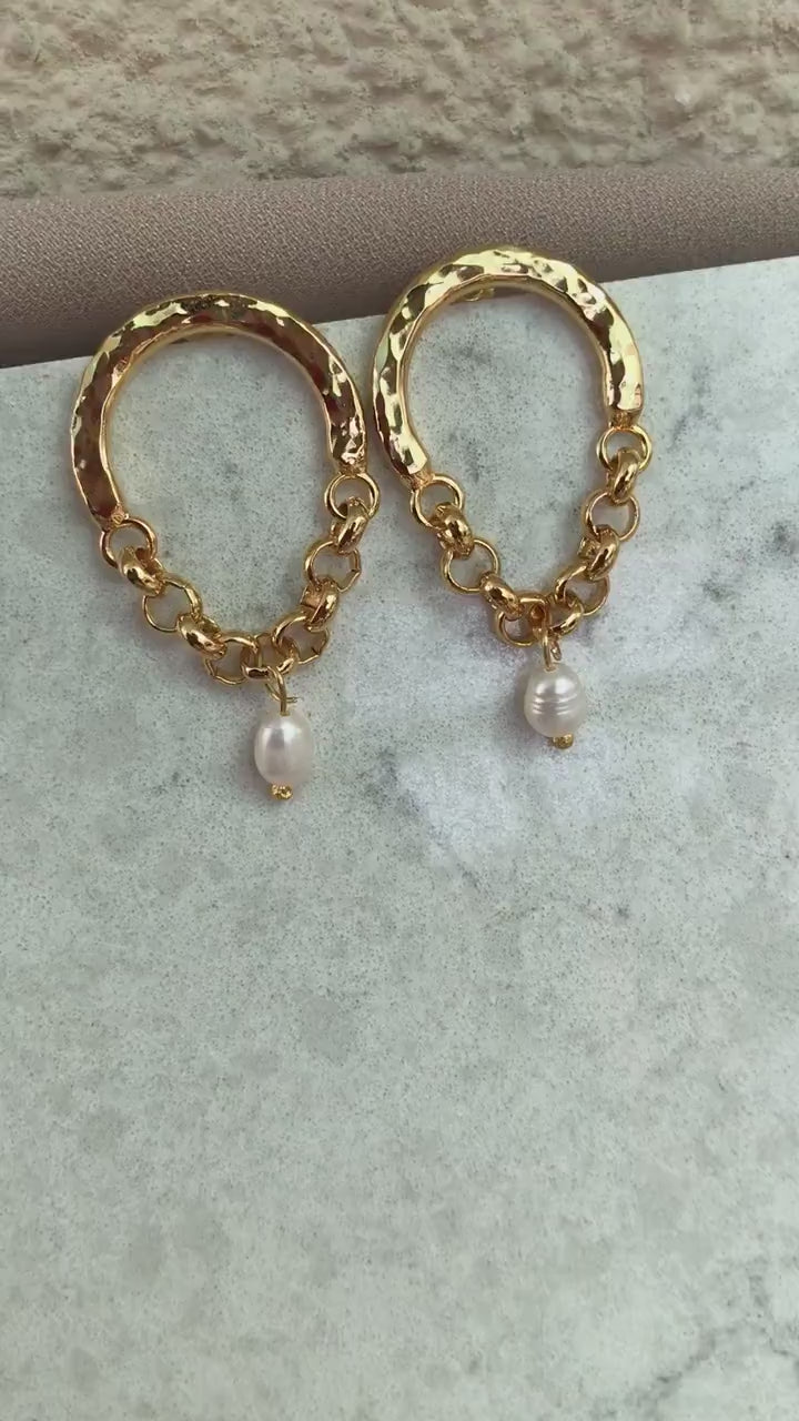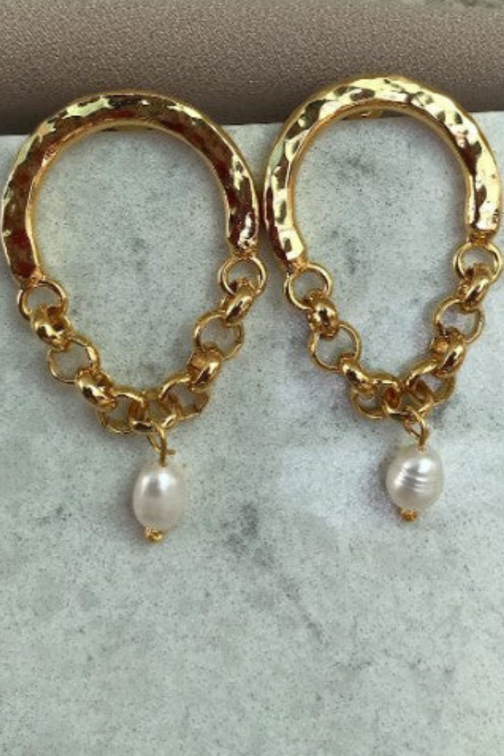 Roza Earrings- Beautiful extension of our Roz earrings-Vezoora's summer elegance in our charming hammered chain stud design with fresh water pearl to add more beauty and summer freshness, designed to give a touch of soft elegance. Plated in 21ct gold, these cute stud earrings have a gorgeous textured finish and are perfect for everyday wear.